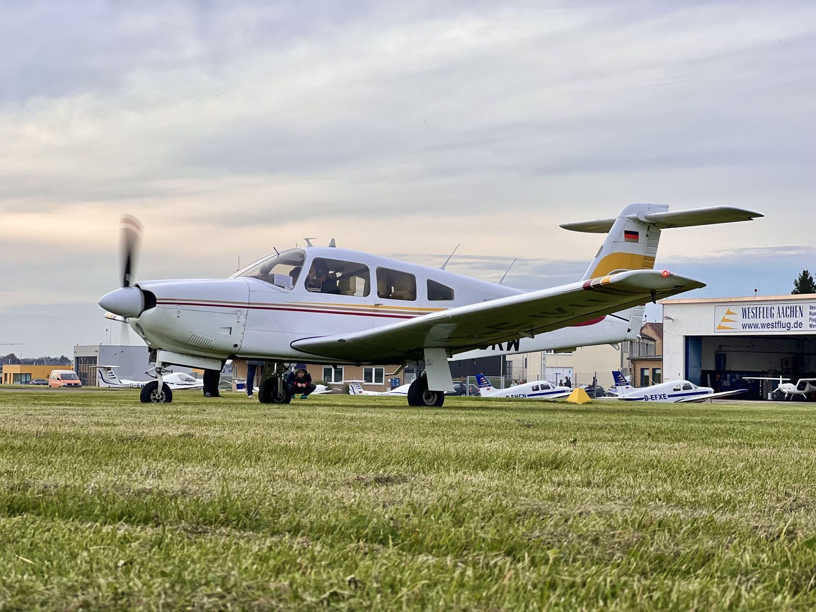 "Kilo Whisky" ist der Rufname unseres Fliegers. Dabei handelt es sich um eine Piper ARROW IV mit dem typischen T-Leitwerk. Das offizielle Kennzeichen ist D-EJKW, wobei die letzten beiden Buchstaben bei Flugzeugen immer als Rufname genommen werden. Unsere Kilo Whisky hat vier Sitzplätze. (Pilot + 3 Passagiere). Das maximale Abfluggewicht beträgt 1.270 kg wovon die Zuladung bei knapp 500 kg liegt. Das beinhaltet Passagiere, Sprit und Gepäck. Die Einhaltung der MTOW (Maximun TakeOff Weight) ist ein wichtiger Sicherheitsfaktor und wird vor jedem Flug gecheckt.